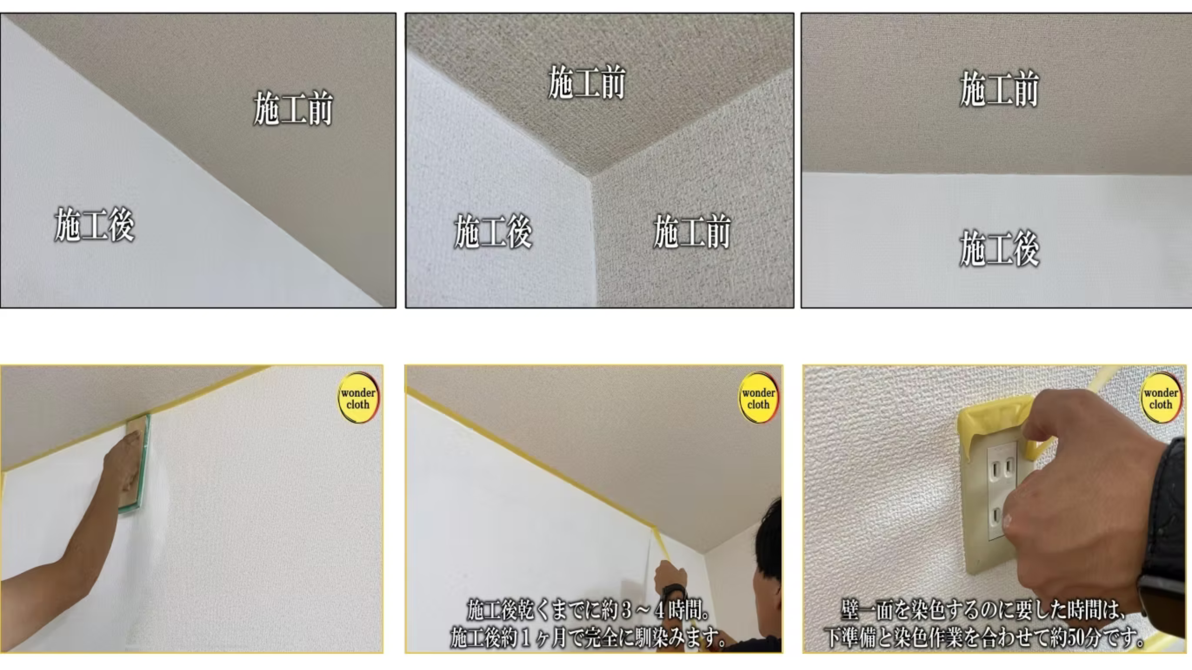 既存の壁紙を剥がさず、専用の染色コート剤を刷毛でコーティングして新品級の見た目へ再生する工法です。