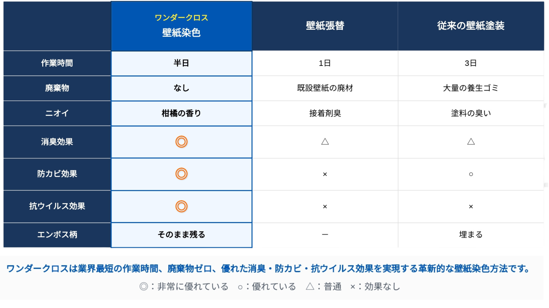 静音・無臭:張替え=糊や剥がしでニオイ/音 → ワンダー=無臭・低騒音