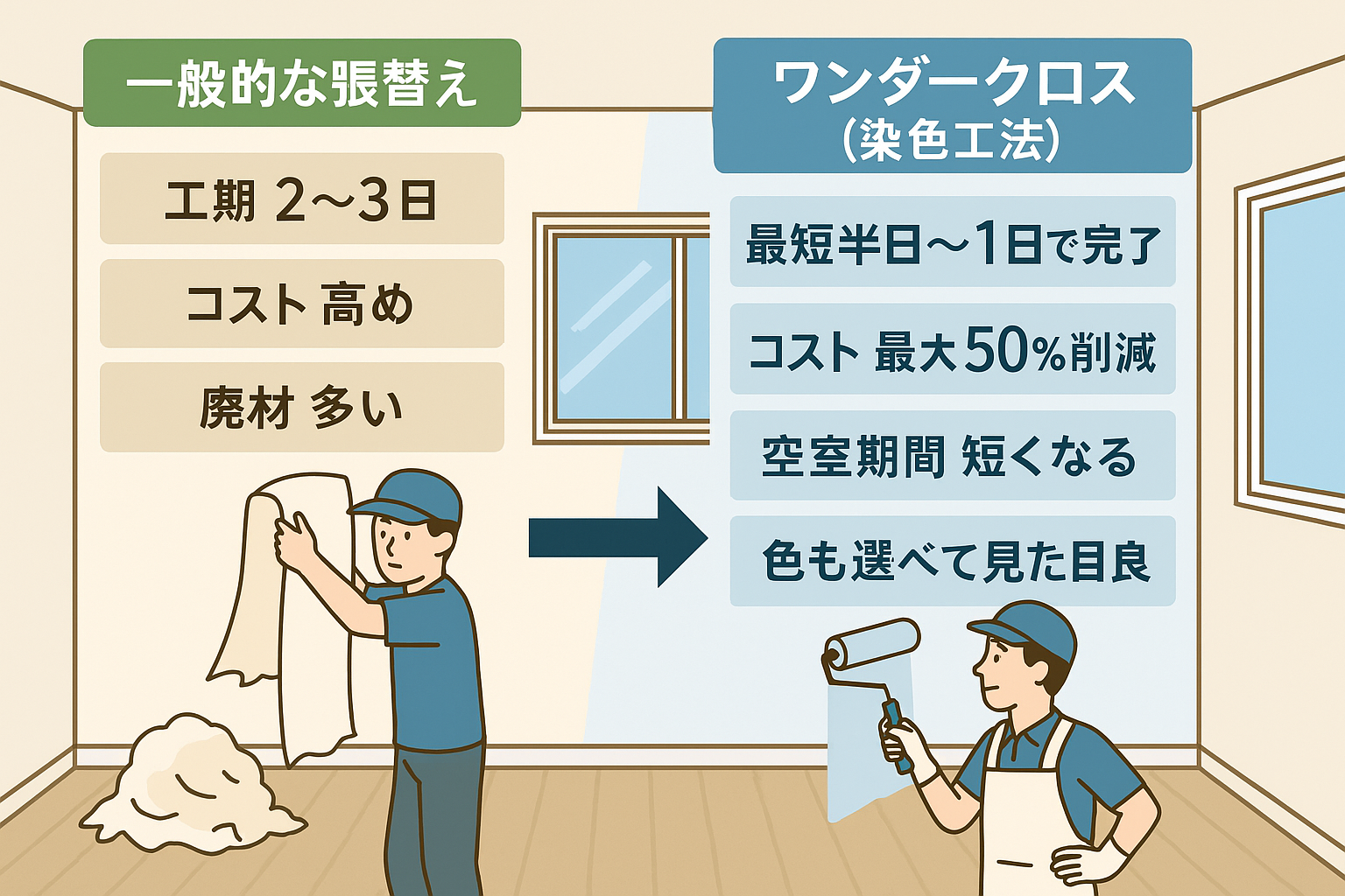 従来の貼り替えより “圧倒的に早く・安く仕上がるクロス替え方法” です。