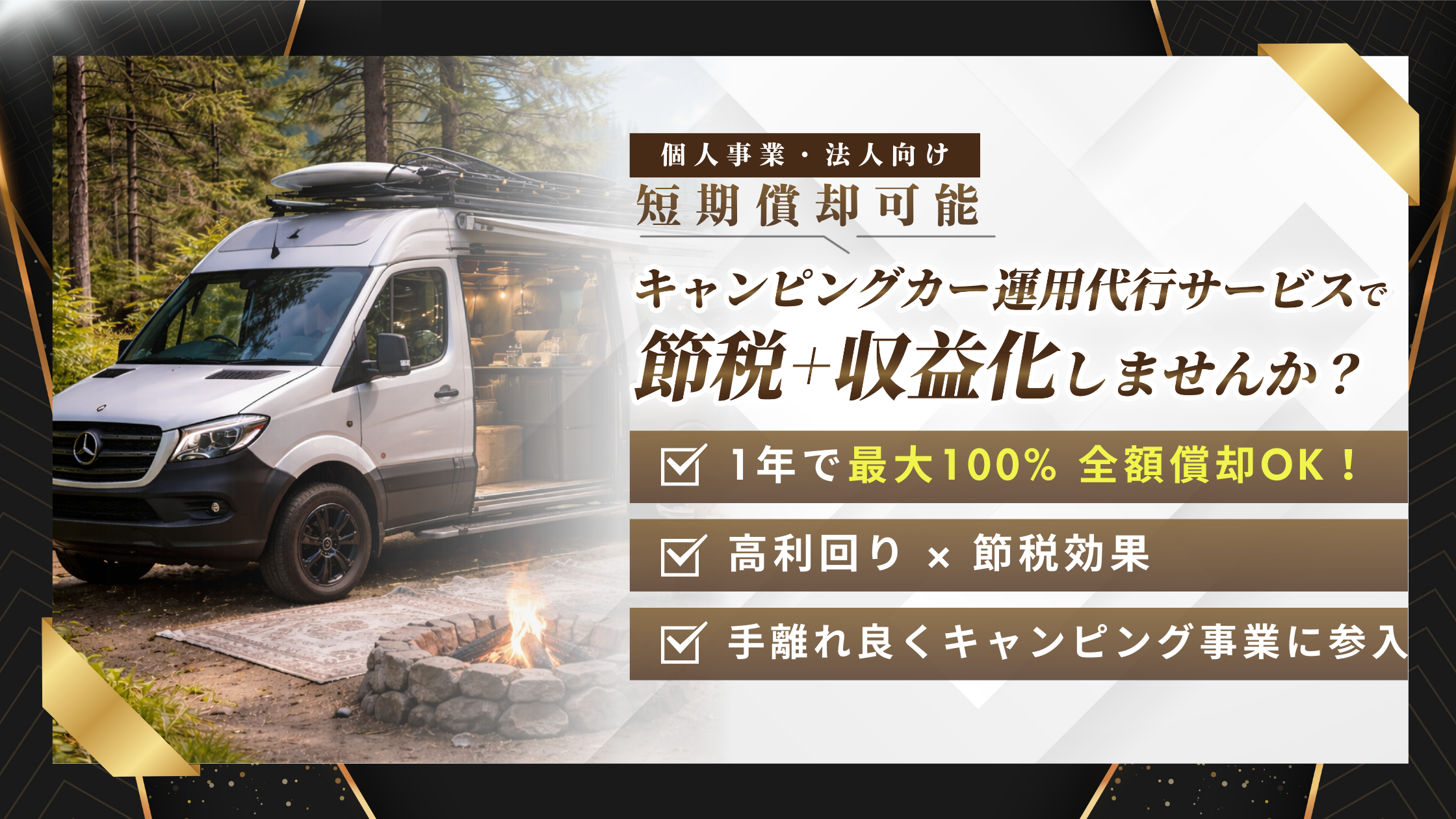 注目を集めている「キャンピングカー投資」は、高い収益が期待できるだけでなく、4年落ちの中古車として購入すれば、1年で減価償還が可能です。