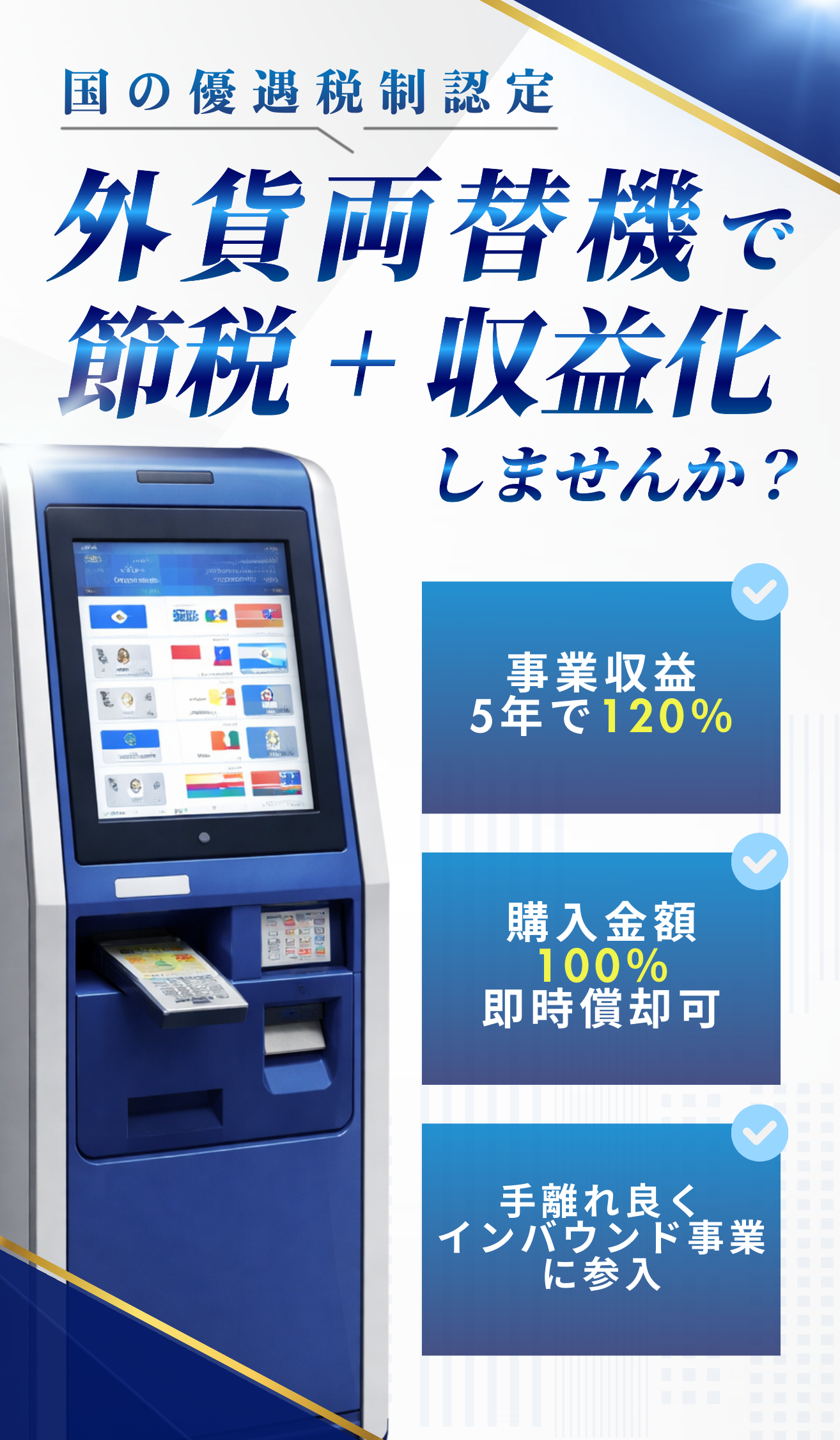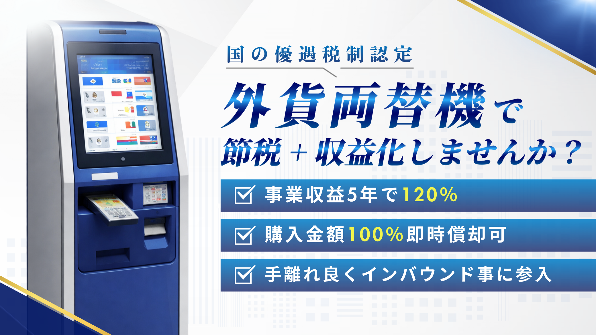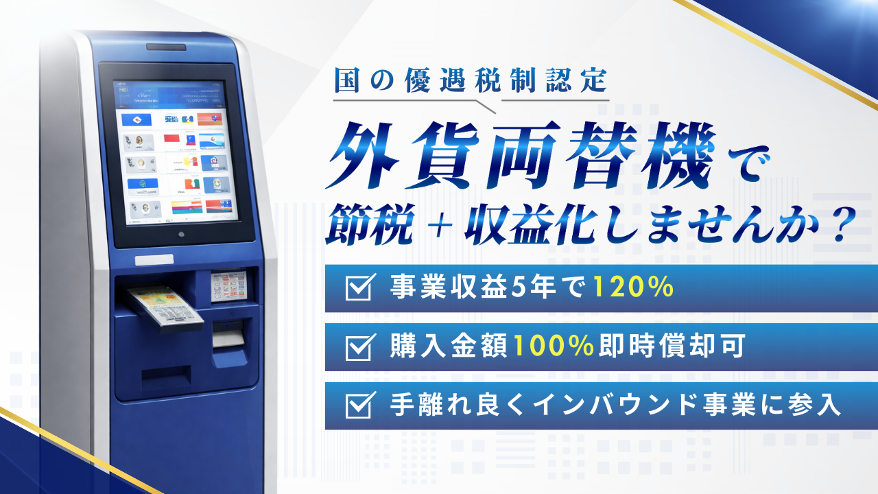 外貨両替機は、観光業・インバウンド需要の増加により 高い収益ポテンシャルを持つ投資対象として注目されています。本記事では、外貨両替機投資の魅力、節税メリット、導入プロセスまでを 誰にでもわかりやすく解説します。