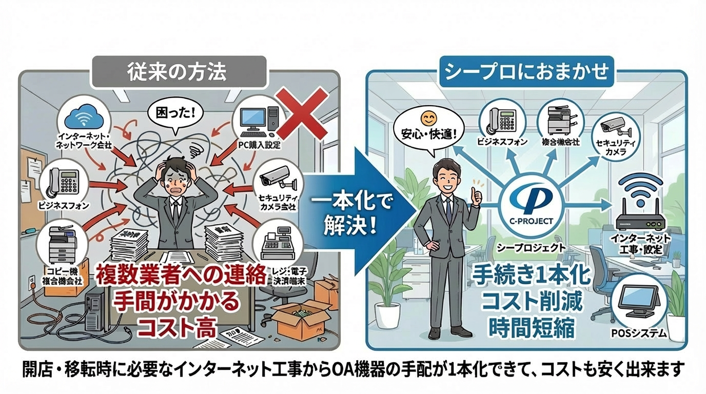 インターネット、電話、法人携帯、コピー機、POSレジ、BGM…バラバラに発注するのが面倒でややこしい