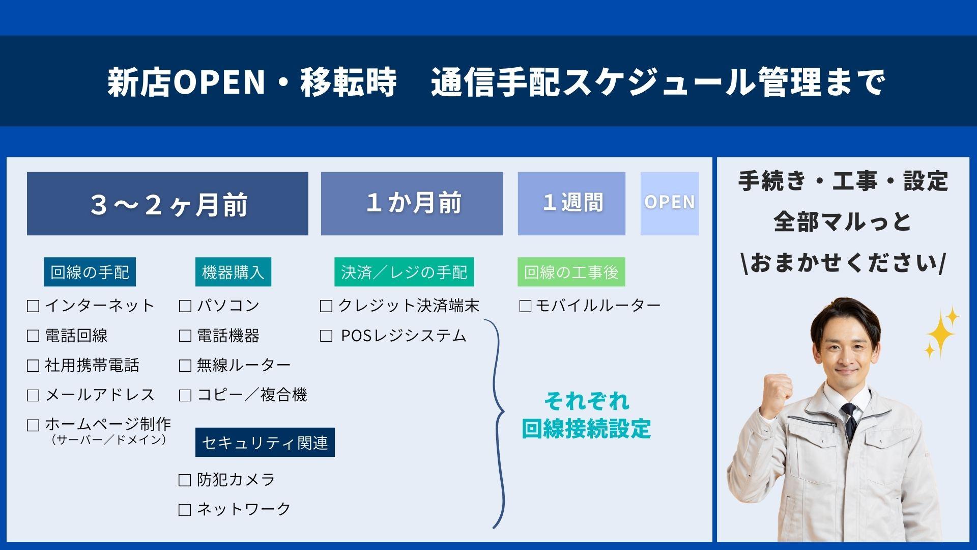 いろんな業者へ個別に連絡したり、自己流で手配すると工事の順番がグチャグチャになり、結局オープン日に間に合わない…そんなトラブルもよく耳にします。 私たちは通信のプロがヒアリングし、